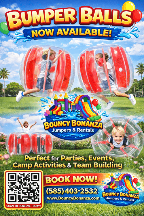 A set of large, transparent or brightly colored inflatable spheres designed to fit over a person’s upper body and torso, bumper balls let renters run, bump, bounce, and roll into one another in a safe, low-impact way. Each ball typically has shoulder straps and hand grips inside so the rider can stay oriented and absorb impacts with the cushioning of the inflated shell. Meant for outdoor lawns, gym floors, or other open, flat areas, bumper balls are used for group play, team-building activities, birthday parties, school events, and casual competitions like bumper-soccer or last-person-standing games.